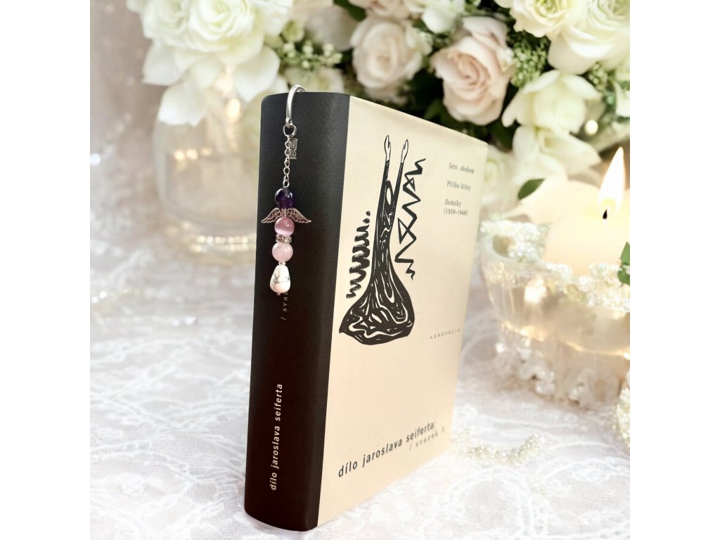 Osobní talisman & šperk Anděl Porodu jsem vyrobila z přírodních minerálů jako je howlit, růženín, ametyst, granát a z obecného kovu. Velikost samotného andílka je 4,5 cm a je možné ho využít několika způsoby - na klíče, přívěsek na kabelku/batoh, do auta, jako záložku, přívěsek na krk nebo ho zavěsit kdekoliv do prostoru.