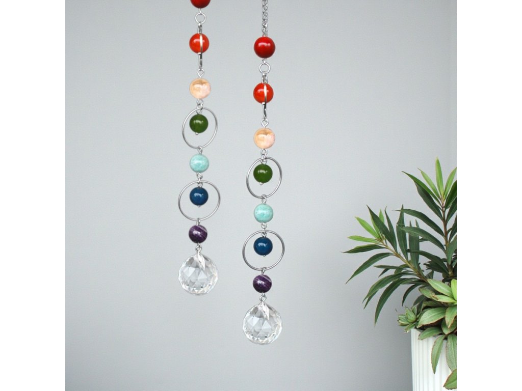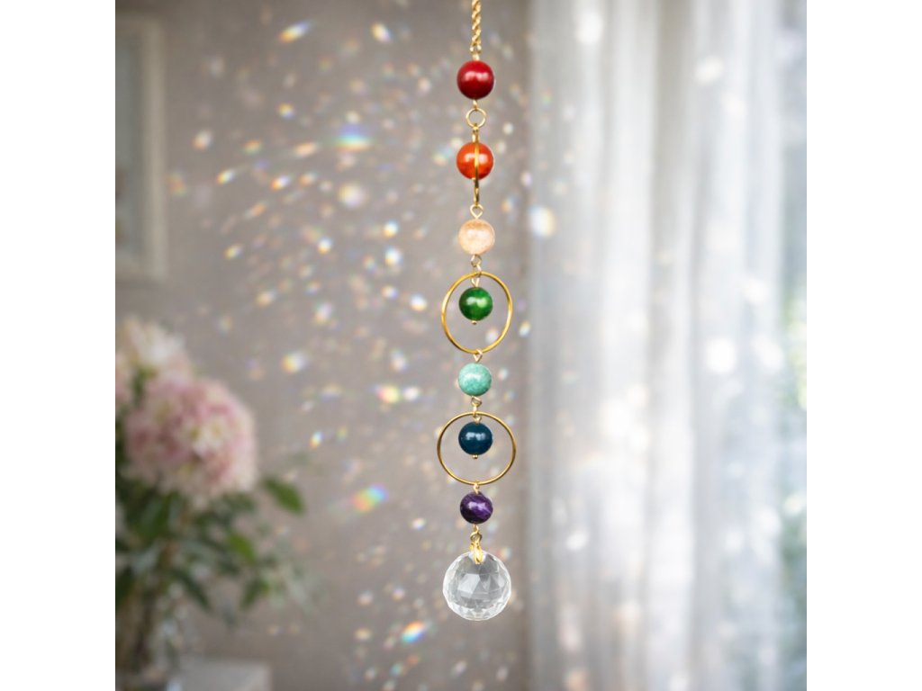 Ručně vyráběný lapač slunce z osmi druhů minerálů v barvách čaker rozzáří váš domov jemnou hrou světla. Spojuje barevnou harmonii, klid a energii vnitřní rovnováhy. Dominantou je broušený křišťál, který při dopadu slunečních paprsků vytváří kouzelné odlesky.