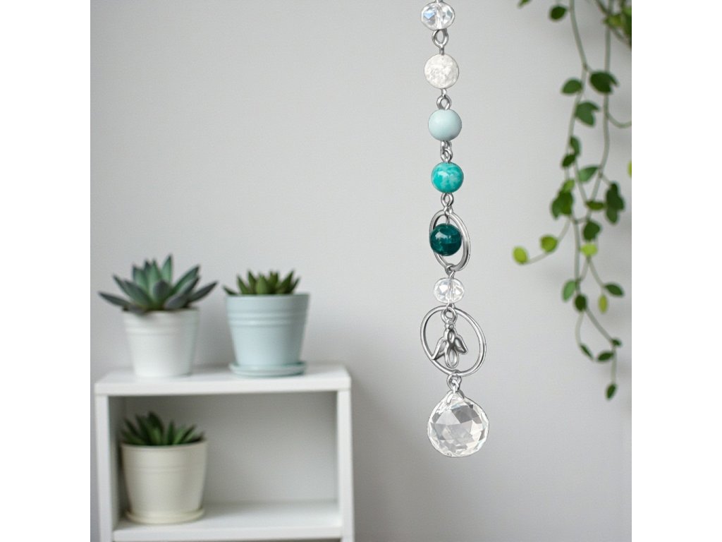 Ručně vyráběný lapač slunce z minerálů jako je amazonit, achát a křišťál. Harmonizuje prostor, rozzáří ho odrazy světla a přináší pocit klidu a vnitřní rovnováhy. Stačí ho zavěsit tam, kde slunce tančí, a nechat světlo rozzářit prostor hravými odlesky.