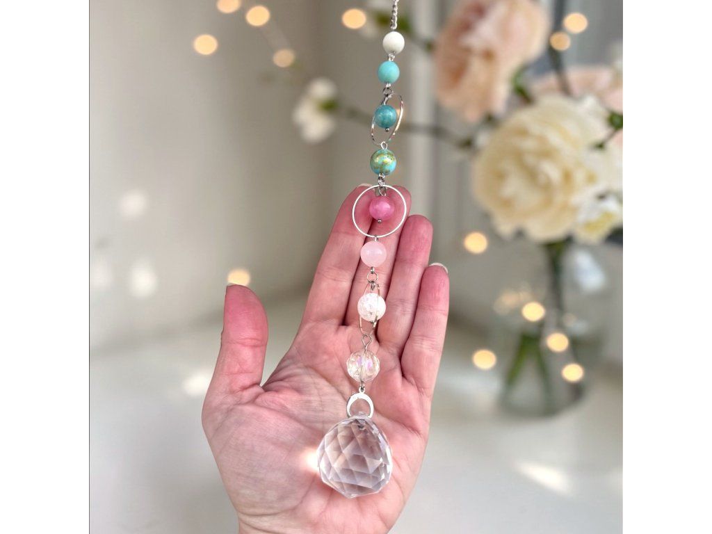 Zahalte svůj domov do jemných barev a hravého třpytu. Lapač slunce Tanec světla jsem vyrobila z minerálů růženínu, kočičího oka, amazonitu a jadeitu v pastelových odstínech. Zakončen je broušeným křišťálovým krystalem, který promění každý sluneční paprsek v kouzelnou hru duhových odlesků. Kovové doplňky jsou na výběr ve stříbrném či zlatém provedení.