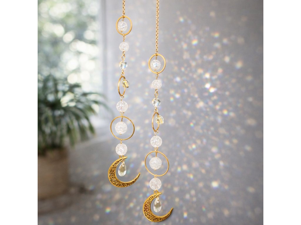 Záře luny je jemný lapač slunce z křišťálu a zlatých prvků, který přináší klid, ochranu a kouzlo měsíční energie do vašeho domova. Symbol půlměsíce doplňuje broušený krystal, jenž odráží sluneční paprsky v duhových odlescích.