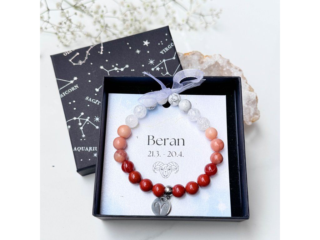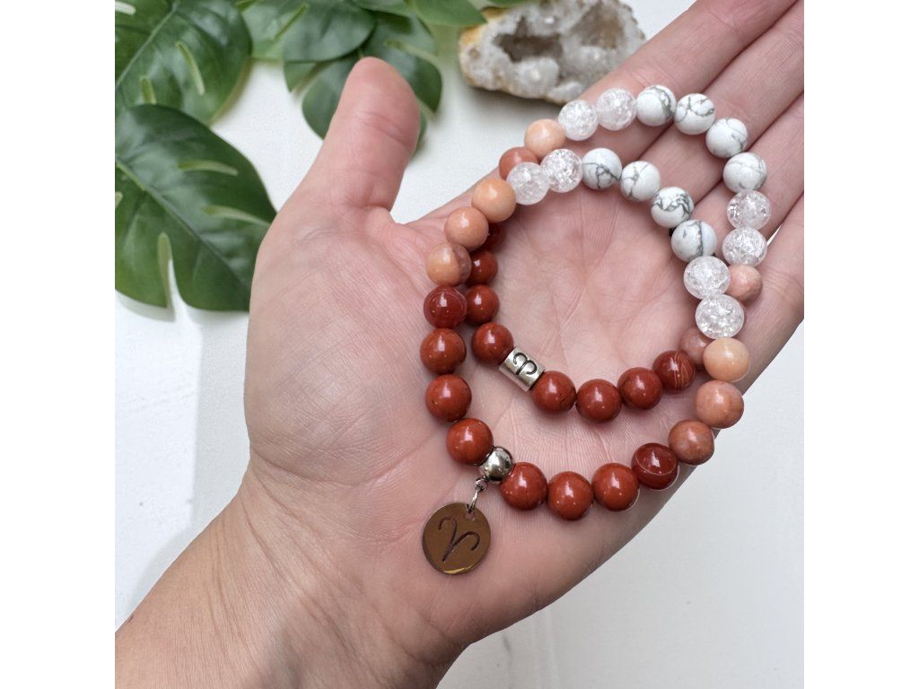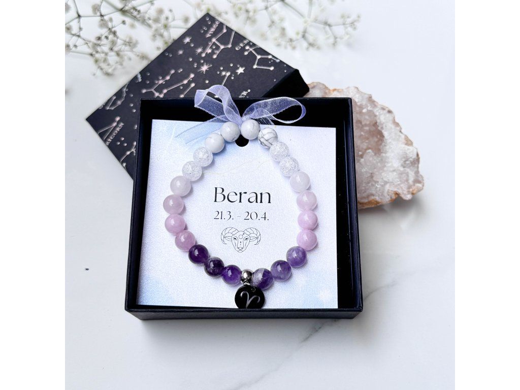 Tento náramek z přírodních, nebarvených minerálů jsem vytvořila speciálně pro ty, kteří se narodili ve znamení Berana (21. března – 20. dubna). Jeho hlavním účelem je podpořit vnitřní klid, posílit intuici a přinést emocionální rovnováhu. Harmonizuje energii Beranů a podporuje jejich duchovní růst. Tento náramek kombinuje jemnou eleganci s hlubokým duchovním významem. Můj jedinečný design nenajdete nikde jinde. Výběr ze dvou barevných variant náramku, možnost zvolit si velikost, preferované balení a symbol znamení (bižuterní korálek nebo ocelový přívěsek).