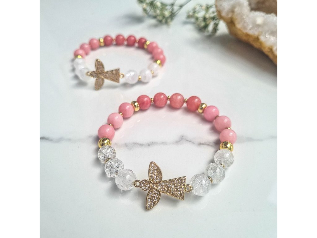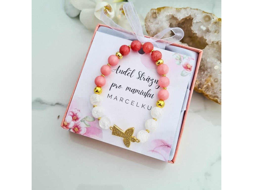 Darování šperku mamince může být krásným způsobem, jak ukázat, že si vážíte svého vztahu jako matky a dcery. Proto jsem navrhla tento překrásný náramek z křišťálu, jadeitu, rodochrozitu a doplnila nádherným zlatým andělem osázeným zirkony. Korálky mají velikost 8 mm a jsou navlečeny na kvalitní pružence, která drží tvar a zároveň umožňuje pohodlné přetažení náramku. Náramky vyrábím v průměrné velikosti zápěstí (cca 18 cm), pokud by bylo potřeba, je možné velikost zvětšit nebo naopak.