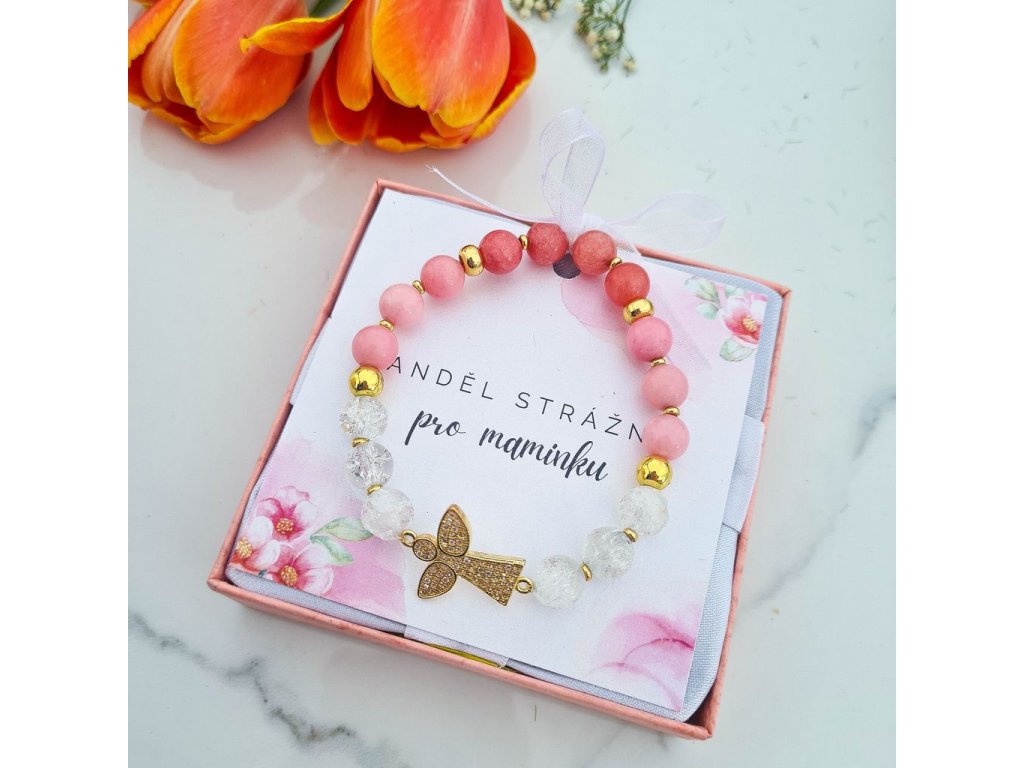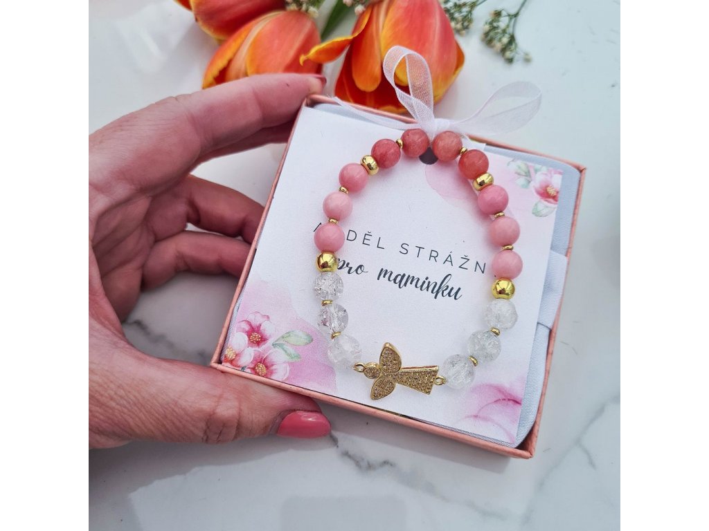 Maminky jsou zpravidla nejvýznamnější a nejdůležitější osobou v našem životě, která nás vychovává, chrání a podporuje. Dávat jim dárek je proto výjimečný způsob, jak vyjádřit svou vděčnost a lásku k nim a ukázat jim, že si vážíme jejich úsilí a obětavosti. Tento nádherný náramek jsem sestavila z křišťálu, jadeitu, rodochrozitu a doplnila ocelovými komponenty ve zlatém provedení. Dominantou náramku je zlatý anděl osázený zirkony. Andílek symbolizuje ochranu, moudrost, harmonii a ve spojení s minerály může být krásným, energetickým, duchovním a unikátním doplňkem, který dodá pohodu a harmonii. Korálky mají velikost 8 mm a jsou navlečeny na kvalitní pružence, která drží tvar a zároveň umožňuje pohodlné přetažení náramku. Náramky vyrábím v průměrné velikosti zápěstí (cca 18 cm), pokud by bylo potřeba, je možné velikost zvětšit nebo naopak.