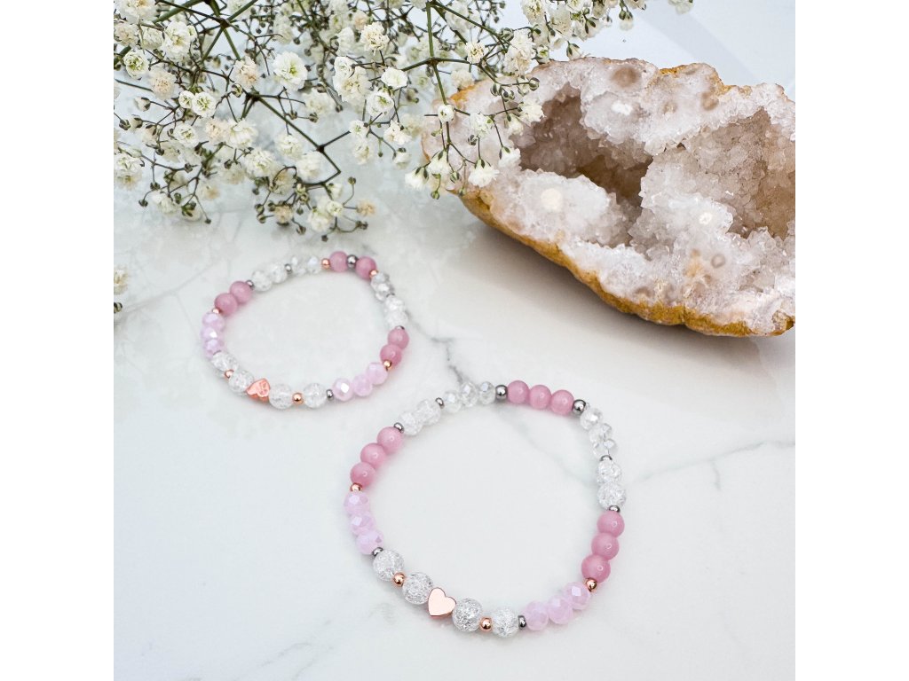 Růžová – křišťál, kočičí oko a skleněné korálky s rose gold srdíčkem. Tóny plné citu.
