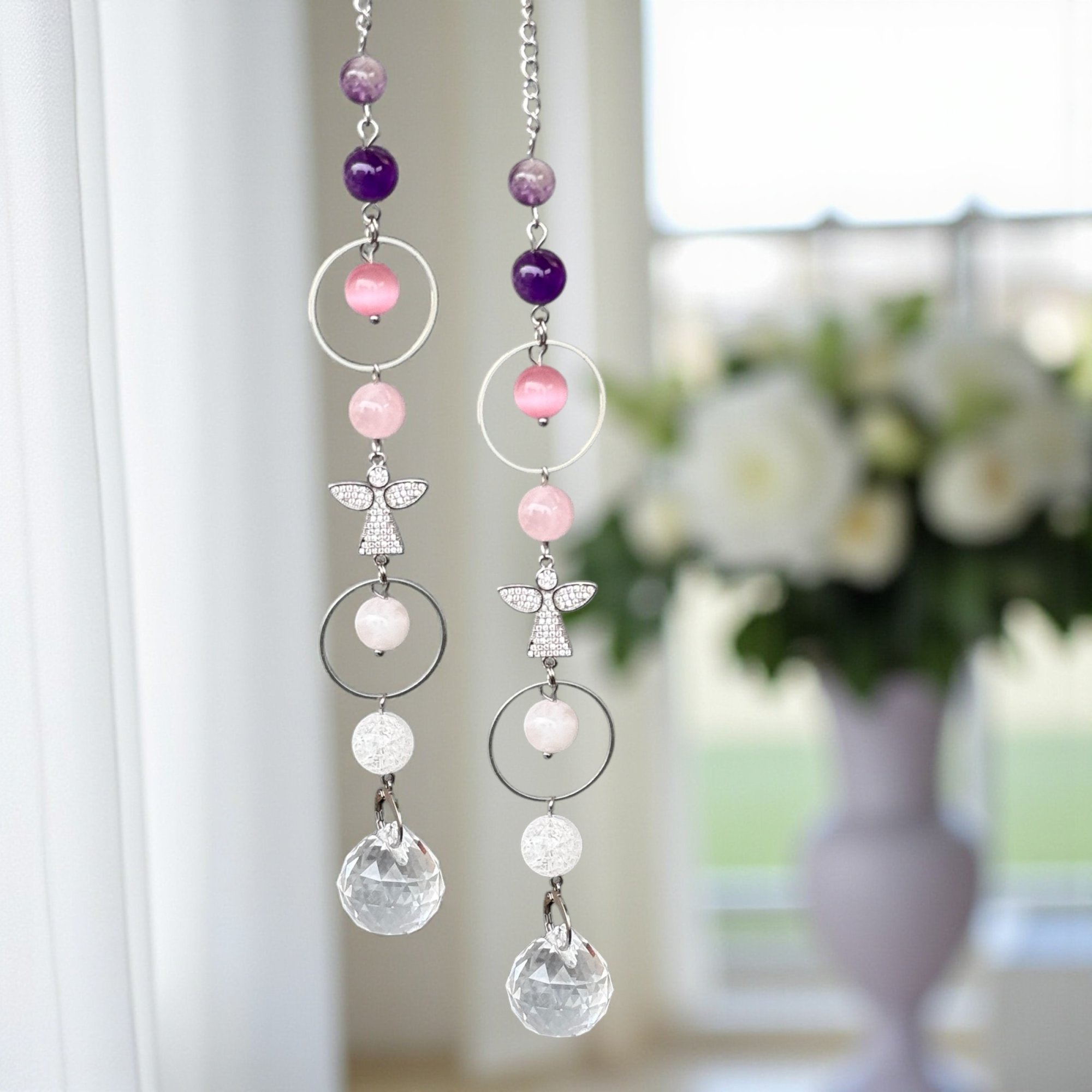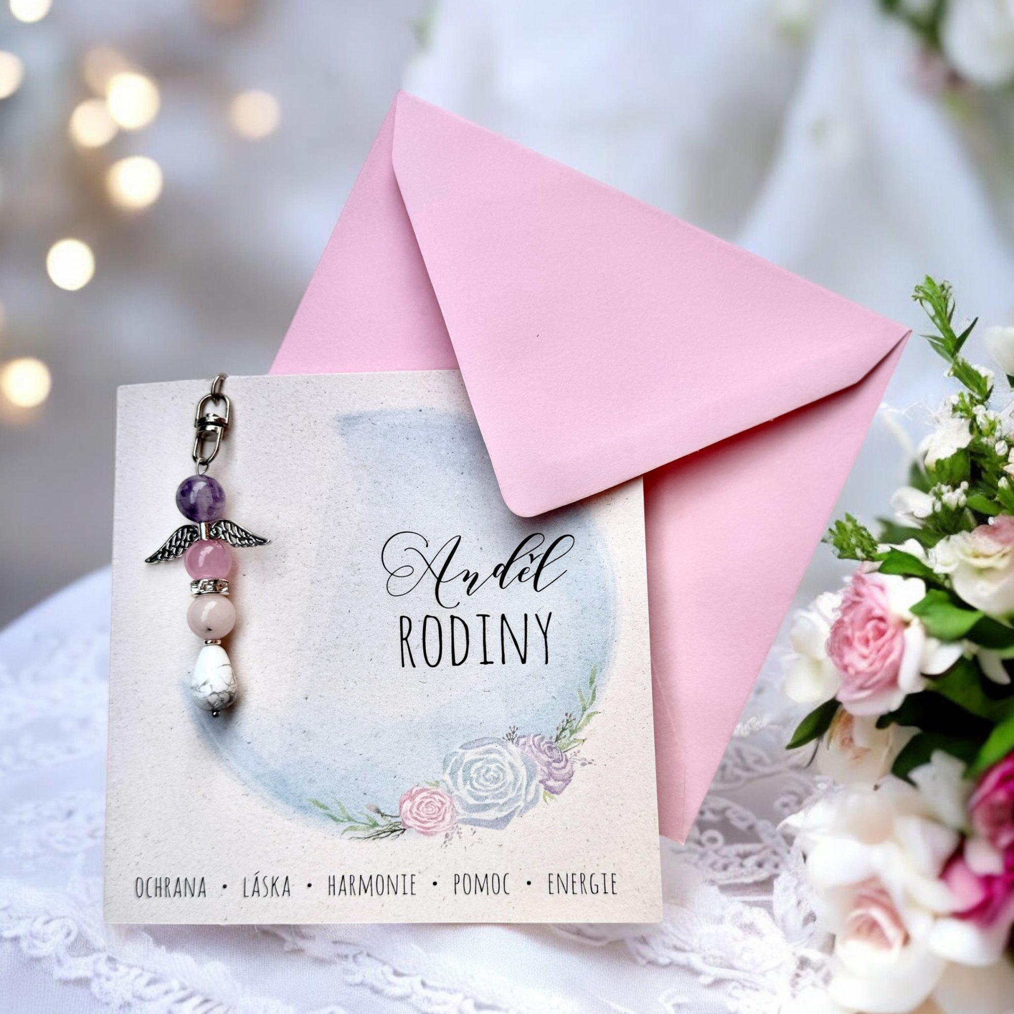 Tento přívěšek jsem vyrobila z ametystu, růženínu a křišťálu, karabiny, kroužku na klíče a ocelového stromu života. Součástí je kartička “Pro paní učitelku” – tento text je možné změnit (pro paní asistentku, vychovatelku atd..) nebo doplnit jméno paní učitelky. Pokud nechcete darovat andílka, pak je tento přívěšek ideální volbou – sestavila jsem ho z nejsilnějších minerálů, navíc v nádherné barevné kombinaci – bude svému majiteli prospěšný a navíc dělat i parádu.