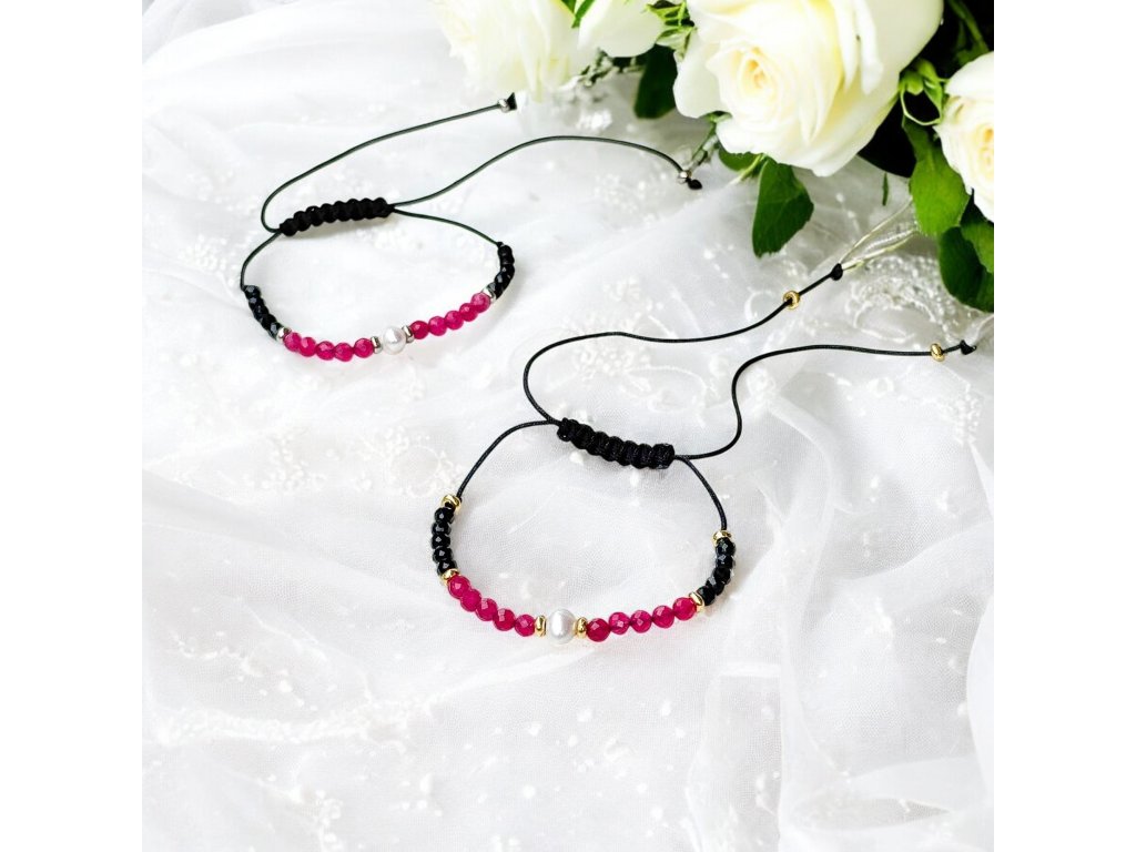 Tyto náramky představuji spojení elegance s přírodní krásou. Sestavila jsem je minerálů a říční perly velikosti 6 a 4mm, konkrétně z onyxu a jadeitu. Perly symbolizují čistotu a klid, zatímco minerály přinášejí energii a sílu přírody. Každý kámen nese v sobě nejen estetickou hodnotu, ale také energii a sílu přírody. Minerály jsem proložila drobnými, ocelovými prvky ve zlatém provedení. Barvu doplňků je možné změnit na stříbrnou nebo rose gold - prosím od poznámky k objednávce. Navlékla jsem je na nylonovou šňůrku a opatřila posuvným uzlíkem, díky kterému se náramek přizpůsobí obvodu zápěstí. Minimální obvod náramku je běžně 14cm, pokud je zápěstí užší nebo naopak (26cm a více), ráda Vám náramek upravím.